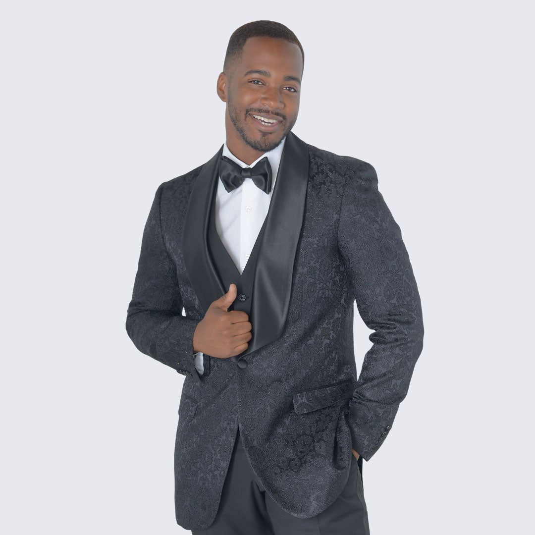 Mens black paisley skinny fit three piece suit with shawl lapel. High end suit with satin shawl collar. This slim cut suit is made of a luxurious rayon viscose/ dacron blend fabric that looks and feels like super 100 wool. Coat has one button front closure . Jacket has interior French facing, two flap pockets with satin trim. Jacket pockets are usable but come sewn shut. Very high quality and well constructed. Three interior pockets . Comes with paisley tapered , flat front trousers with narrow leg opening . Subtract six inches from your jacket size to determine your pant waist size. Meaning, if the coat size is a 40R the pants waist will be a 34R. Pants are lined to the knee. Pants come unfinished at the bottom so that you can hem at your proper length. Comes with a solid five button fullback vest. This suit is ideal for weddings, proms, and other formal events. Dry clean only. Please note, this is a skinny fit suit. It has a tighter cut, especially in the pants. If you are in between sizes, we suggests you go with the larger size.