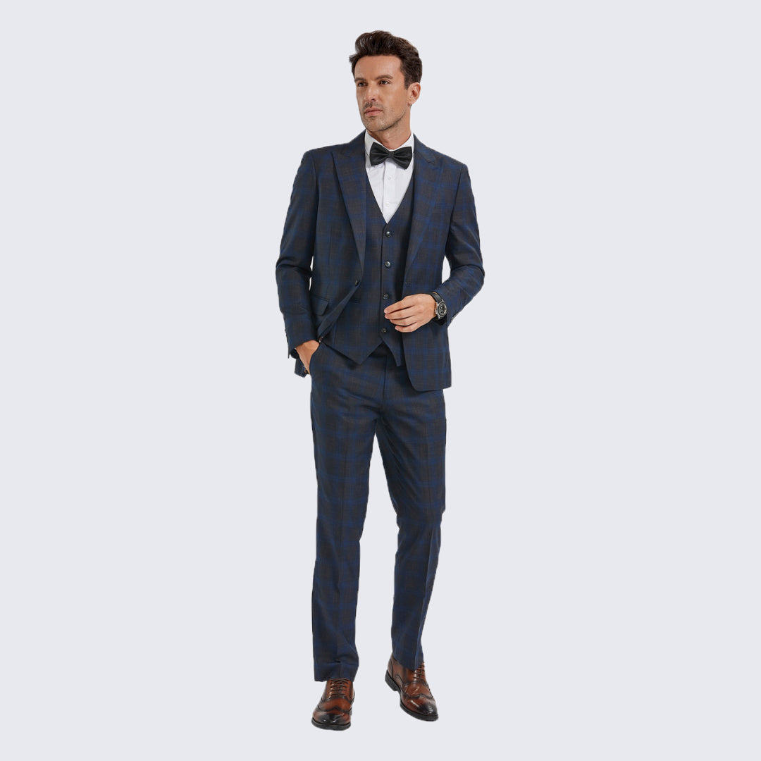 Blue Plaid Skinny Fit Suit with Peak Lapel