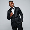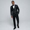 Make a bold statement in this black paisley three-piece suit with a satin shawl lapel and skinny fit—perfect for weddings and proms. Shop Perfect Tux.
