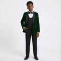 This boys green velvet tuxedo 5-piece set offers a refined, modern look for weddings, ring bearers, and formal occasions. Designed for kids and teens, this complete tuxedo package combines rich velvet texture with a comfortable fit made for all-day wear.