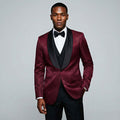 This burgundy paisley three-piece suit delivers standout style with a refined, modern edge. The satin shawl lapel adds a formal touch, while the skinny fit creates a sharp, fashion-forward silhouette. Crafted from a premium fabric blend designed to mimic the look and feel of fine wool, this suit offers elevated style without sacrificing comfort. Thoughtful construction details—like French facing, satin-trimmed pockets, and a tailored vest—make this a confident choice for prom or a memorable wedding look.