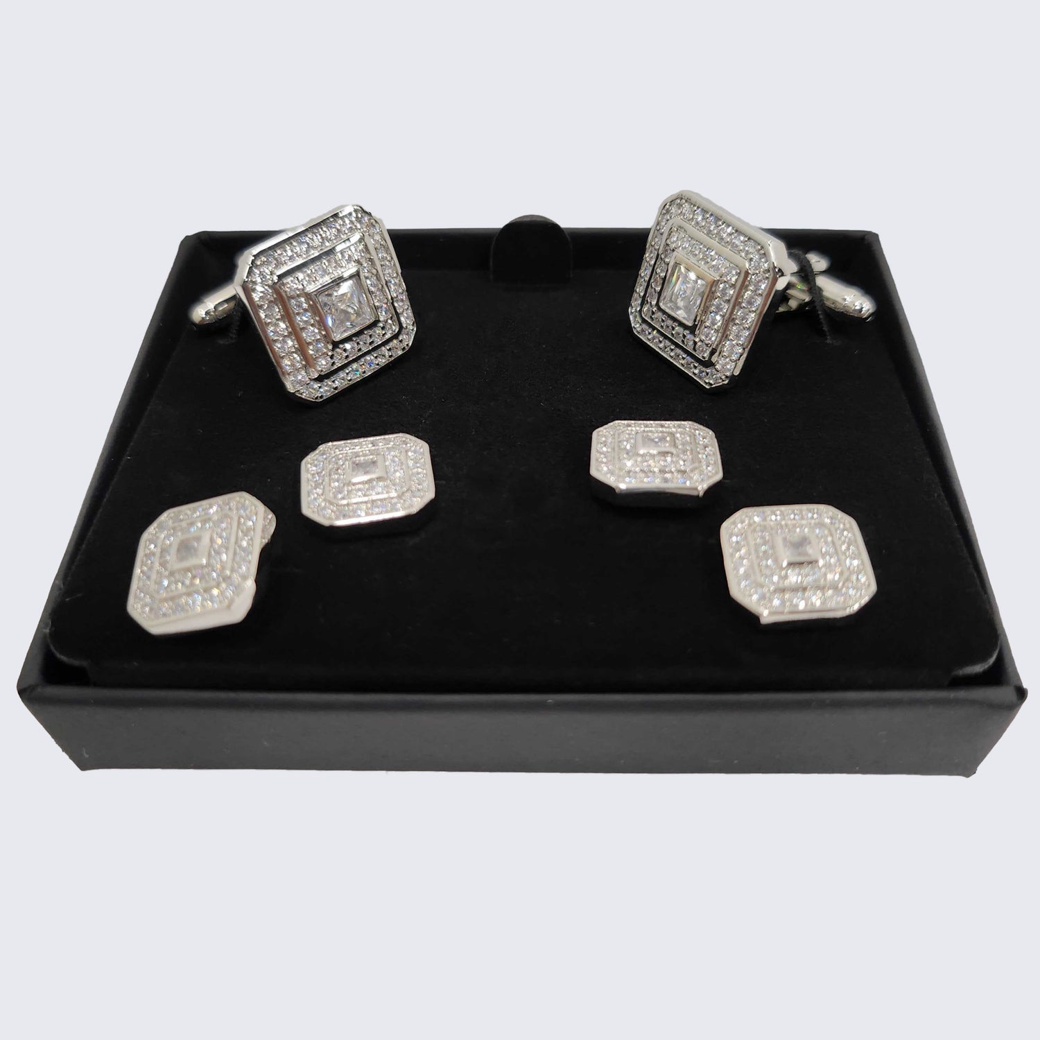 Silver Pave Square Cubic Zirconia Studs and Cufflinks