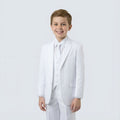 Boy's white suit 5-piece set. Modern Fit. Set includes: coat, pants, vest, dress shirt, and necktie. Available sizes for toddlers and teens. High quality boys tuxedo. Made of exceptional Poly/Rayon blend fabric. Perfect for weddings, parties, or an