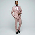 This lavender tuxedo delivers a modern, standout look with its stone-embellished peak lapel and coordinated four-piece design. The skinny fit creates a sleek silhouette, while the Tetron silk lining ensures comfort and quality construction. A distinctive set that blends bold color with refined tailoring.