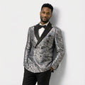 Grey Jacquard Double-Breasted Tuxedo Jacket with Black Satin Peak Lapel – Wedding & Prom