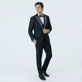 This black tuxedo set combines classic elegance with modern flair. The stone-embellished peak lapel adds subtle shine, making it perfect for evening wear. Its skinny fit creates a sharp silhouette, while the Tetron silk lining ensures comfort throughout the night. Complete with a vest, bow tie, and trousers, this four-piece set delivers a polished, ready-to-wear look for your most important events.