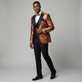 This red and gold jacquard tuxedo set is designed to turn heads while staying true to classic formalwear structure. The textured jacquard pattern adds rich depth and a premium feel, while the satin peak lapel sharpens the look with clean contrast. The modern fit delivers a confident silhouette that’s tailored without being restrictive, and the included double-breasted vest elevates the overall presentation for a complete, layered formal look.