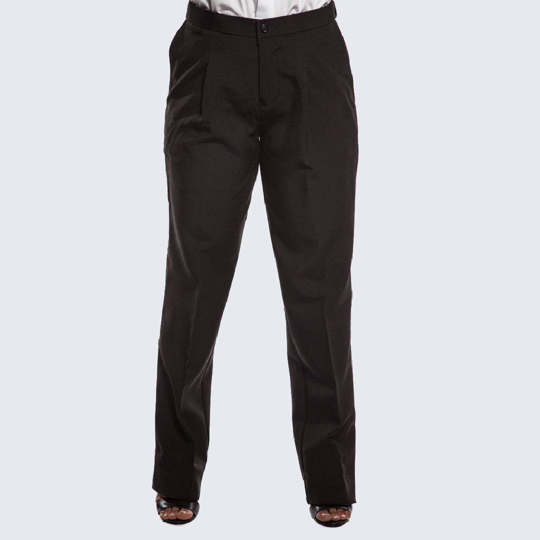 Women's formal double pleated tuxedo pants. These tuxedo trousers are 100% polyester. Two front pockets, two back pockets with satin leg braid. Expandable waist. Perfect for hospitality and uniform wear. Made specifically for women, these pants are comfortable and easy to wear. Pants have an open leg, meaning they are un-hemmed and unfinished at the bottom. Available in a wide range of sizes from 2-28. For sizing information view the sizing chart.