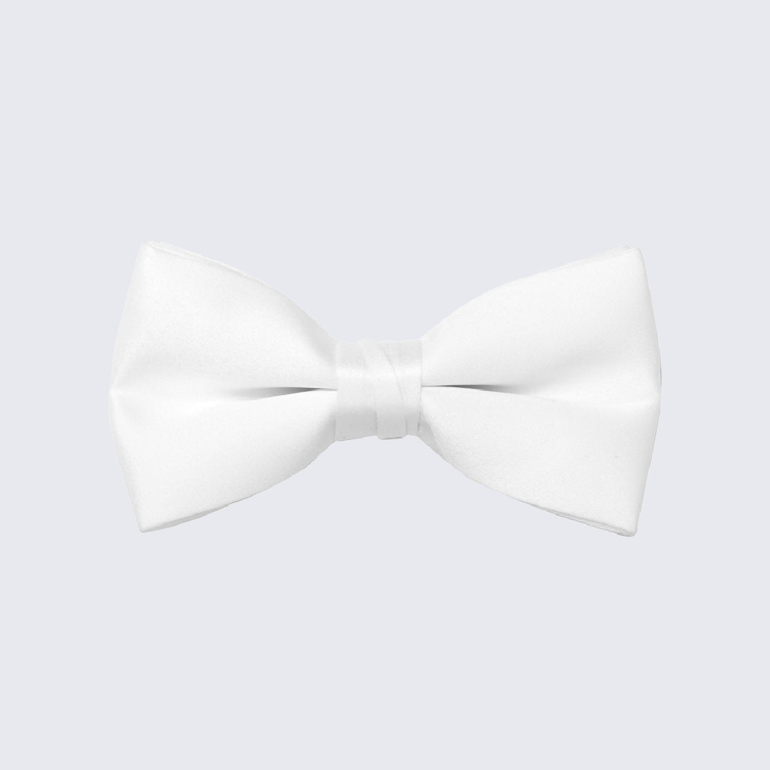 Men's satin white pre-tied bow tie. This solid colored satin bow tie is made of 100% polyester. Adjustable strap that wraps around the neck that can be adjusted down to a 13" neck and out to a 22.5" neck.  Bow tie measurements: 2.5" wide and 4.5" long. This bow tie is perfect for weddings, proms, formal events, or those who are just looking to spice up their look.